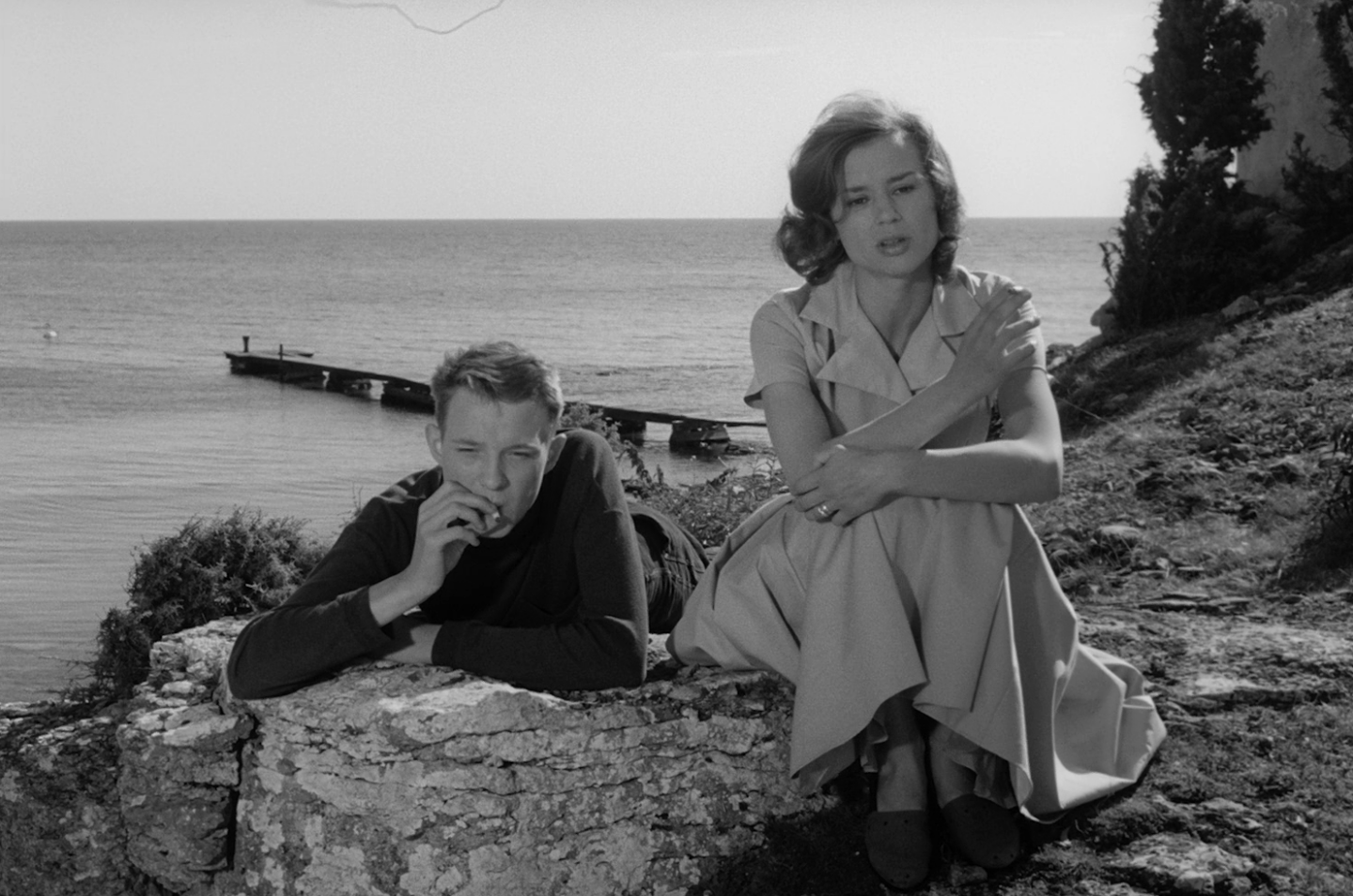 Por sinal, esse é um ponto importante: as escolhas de locação do diretor para situar e posicionar seus personagens – algo que faria cada vez mais em seus filmes seguintes, em especial O Silêncio (1963) e Persona (1966) – são de suma importância simbólica. A ilha como ambiente isolado do resto do mundo e que evidencia ainda mais a distância emocional entre seus quatro habitantes; o casarão belo por fora e rústico e envelhecido por dentro, com o quarto de cima evidenciando um papel de parede que parece abrir portais para mundos sombrios com seus rasgos úmidos; o tal navio naufragado que funciona tanto como um abrigo para a tempestade quanto como palco para relações traumáticas; e, claro, o pequeno barco usado por Martin e David como uma sessão de terapia isolada entre ambos, isolando-os no oceano para reconhecerem suas posturas individualistas em relação a Karin e Minus. Não é à toa que o helicóptero que chega para levar Karin novamente para o hospital psiquiátrico no final é a única afetação externa de sua narrativa.